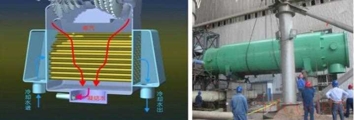 ① 凝汽器壳体的就位和连接:鉴于凝汽器结构尺寸相当庞大,其支承方式多采取 通过弹簧支座坐落在凝汽器基础上的支承形式。凝汽器与低压缸排气口之间的连接,采 用具有伸缩性能的中间连接段,凝汽器与汽缸连接的全过程中,不得改变汽轮机的定位 尺寸,并不得给汽缸附加额外应力。