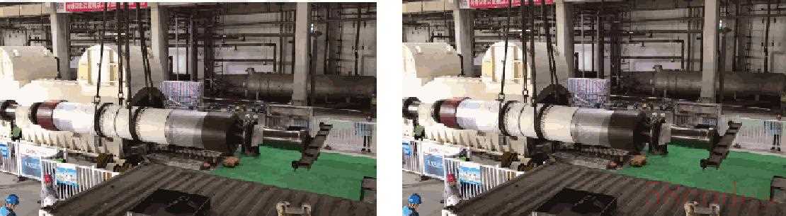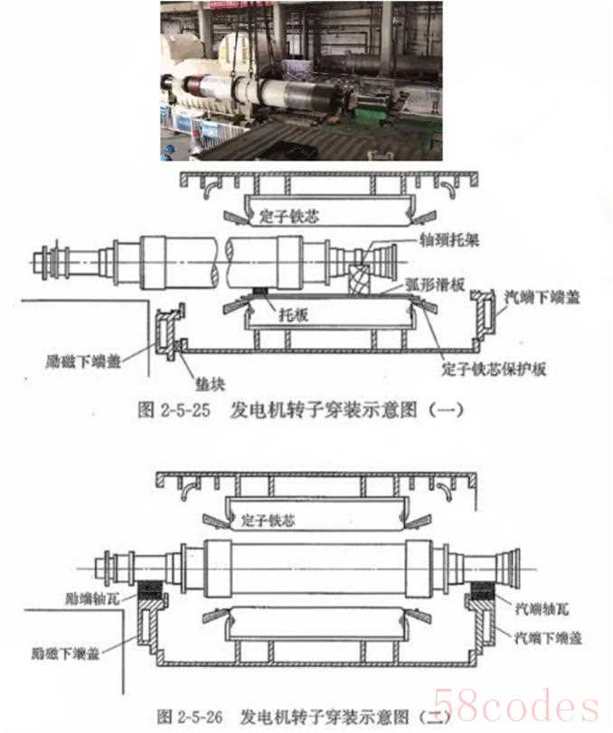 ② 转子穿装要求在定子找正完、轴瓦检查结束后进行。转子穿装工作要求连续完成,用于转子穿装的专用工具由发电机制造厂提供,不同的机组有不同的穿转子方法, 常用的方法有滑道式方法、接轴的方法、用后轴承座作平衡重量的方法、用两台跑车的方法等。