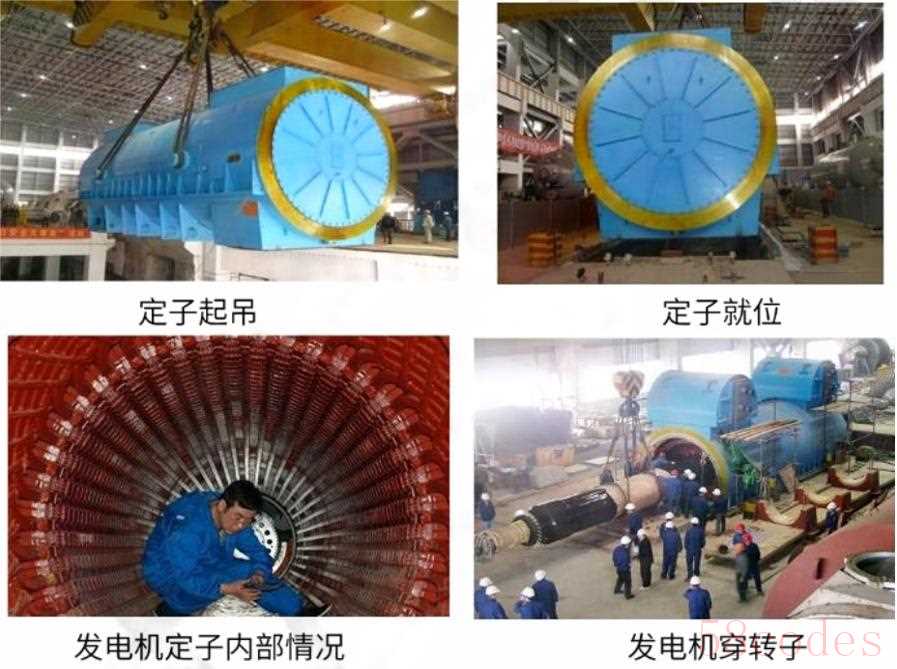发电机设备的安装程序:台板(基架)就位、找正 → 定子就位、找正 → 定子及转子水压试验 →发电机穿转子 →氢冷器安装 →端盖、轴承、密封瓦调整安装 →励磁机安装 → 对轮复找中心并连接→整体气密性试验等。