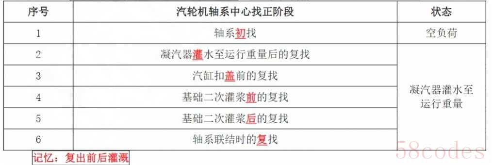 例如:某工程600MW 机组轴系中心找正内容及其各对轮找中心时的端面张口和圆 周高低差预留值分别为:轴系中心找正要进行多次,即:轴系初找;凝汽器灌水至运行 重量后的复找;汽缸扣盖前的复找;基础二次灌浆前的复找;基础二次灌浆后的复找; 轴系联结时的复找。除第一次初找外,所有轴系中心找正工作都是在凝汽器灌水至运行 重量的状态下进行的。