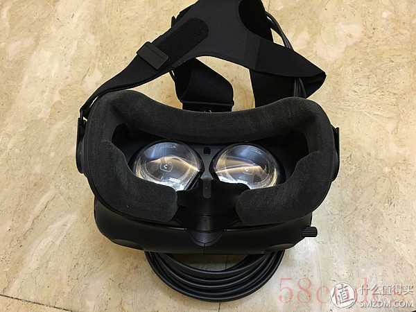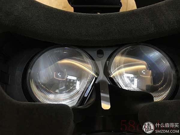 头显内部,中间上方是距离感应器,镜片有一圈圈圆环。头显的重量还能承受,显示效果要你调好瞳距和显示距离才会最清晰,虽然单眼分辨率达到1080*1200,但是颗粒感还是有的,如果你沉浸在VR世界里就不会注意到这些了。显示边缘没中间锐利,希望下一代改进吧。