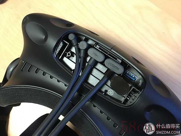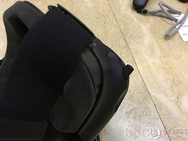 右边系带,可以拔出灰色圆环调节眼睛和显示屏距离,左右可以单独调节,调远了可以容纳眼镜,右下的突出是瞳距调节旋钮。