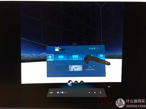 戴上头显呼出Steam界面是这个样子的,你可以看到手柄所在的位置、电量、还有手柄射出的一条蓝光,它是用来指示和选择用的,用光线指着界面上的选项按扳机键就能进入了,后面的网格是虚拟墙,提示你不要超出设定区域。