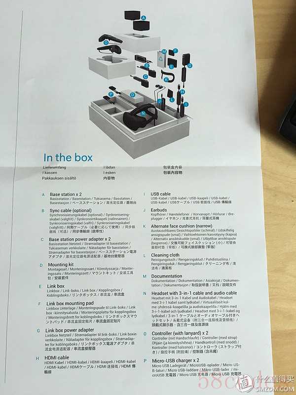 这就是全家福,分别有一个头戴显示器,两个手柄和它们分别的充电线和充电器,两个激光基站和它们的电源,基站的墙面安装板,一个串流盒,一个耳机,一个替换面罩,公对公USB线,HDMI线,还有一块擦镜布。