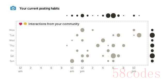 黑圈表示通常在何时发布媒体。浅灰色的圆圈显示 的社区进行互动的时间。最大的浅灰色圆圈代表发布的最佳时间。