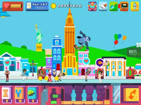 在游戏里,你不光亲手造出成吨的苏打,还要负责日本、美国、埃及等五个“国家”(为什么加引号等下说)的建设。你亲手由地基开始,搭建结构,安上房顶,立好柱子,在点击的过程中,美国国家博物馆完工了。整个过程中都有精致的动画和华丽的烟火效果,提醒着你,你在干一桩伟大的事业。你目睹“美国”由一片荒原和工地,变为屹立着NASA总部,帝国大厦和自由女神像的不夜城。其他的模拟经营游戏也有类似的体验,但不像《苏打世界》有如此简明的操作和强烈的反馈。这些操作和反馈创造的成就感和快感不亚于游戏的主题:制造苏打水。