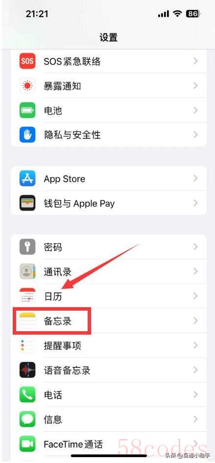 2. "向下滚动并点击“备忘录” (Notes)。"