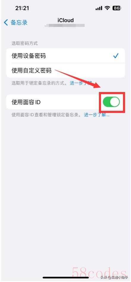 3、进入icloud,勾选“使用面容id”右侧按钮开启。