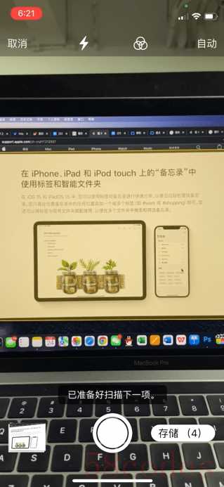 如果开启了自动快门,那就只需要举着手机就行了,然后再看一下拍的好不好。扫描的文稿会自动存储在「备忘录」中。