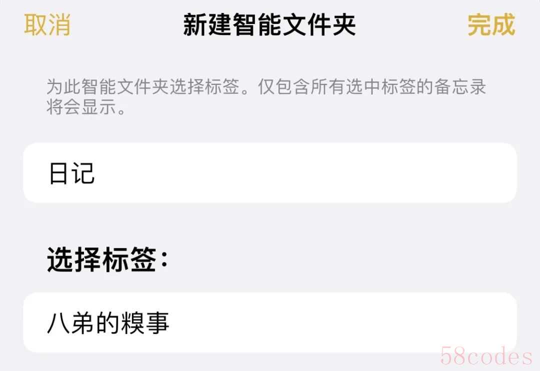 随后,我们为这个智能文件夹命名,并确认一个标签名,比如机哥就设为“日记”,标签为“八弟的糗事”。