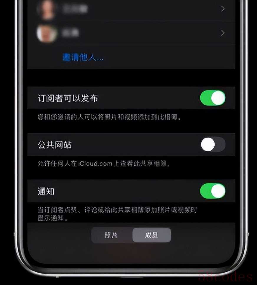除了添加成员外,用户还可以管理订阅者的发布权限、开启相簿通知,以及选择性开启“公共网站”,通过 iCloud.com 对照片进行共享。