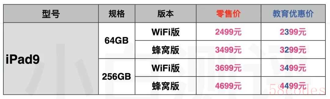 价格上,新款第 9 代iPad 具体国行价格:①64GB WiFi版售价2499元,蜂窝版售价3499元;②256GB WiFi版售价3699元,蜂窝版售价4699元。使用教育优惠可以便宜100-200元左右。