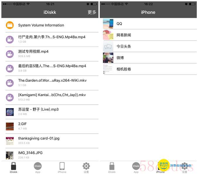 用过16GB版iPhone的都知道,这点容量我们根本不敢往里面塞本地视频,虽然现在很多视频资源都能通过在线观看,但有许多内容线上视频还是难以满足我们,你都懂的。利用iDiskk Pro我们可以在iPhone上直接播放iDiskk U盘里的视频文件。