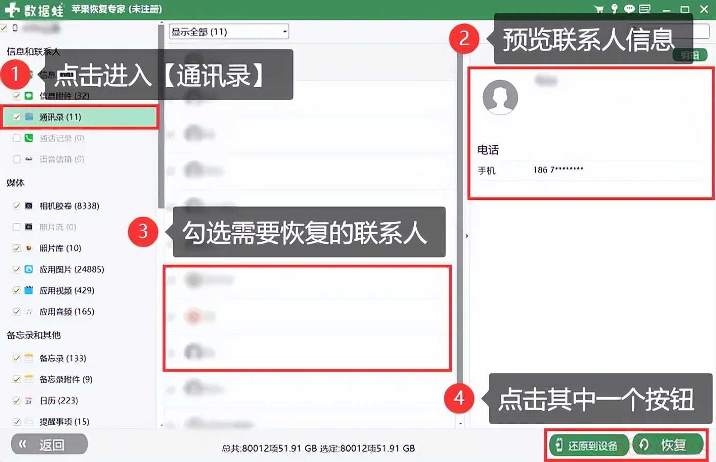 手机通讯录突然没了怎么恢复?数据蛙苹果恢复专家兼容各种型号的苹果设备,无论是iPhone还是iPad,都能支持数据恢复。同时,它还支持批量恢复,能够一次性恢复多个联系人,大大提高了恢复效率。如果您遇到了手机通讯录丢失的问题,不妨尝试一下这款软件来找回您的数据,其恢复概率还是比较大的。