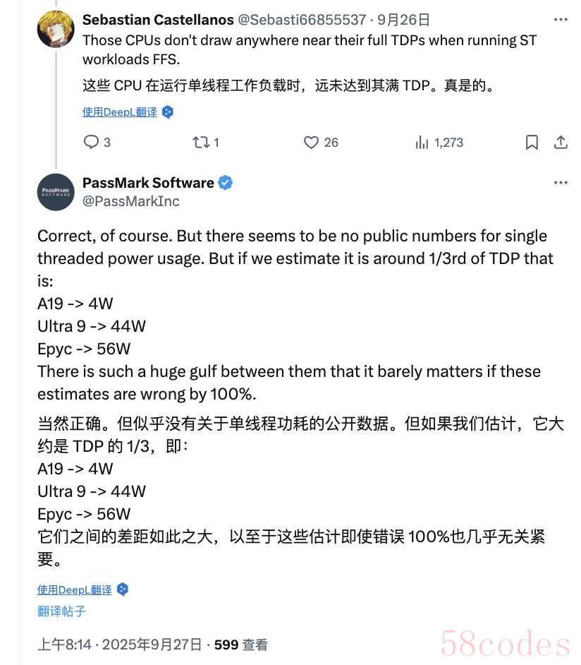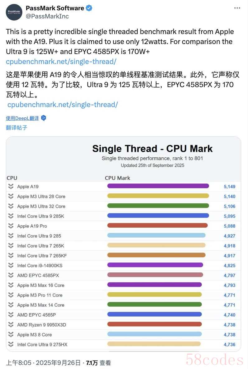 对此,PassMark 给出了估算:A19 单核约 4W,英特尔 285K 约 44W,AMD EPYC 约 56W。即便估算有偏差,三者差距仍巨大,A19 在能效上的领先毫无悬念。