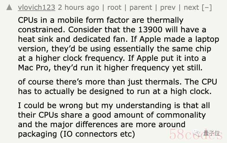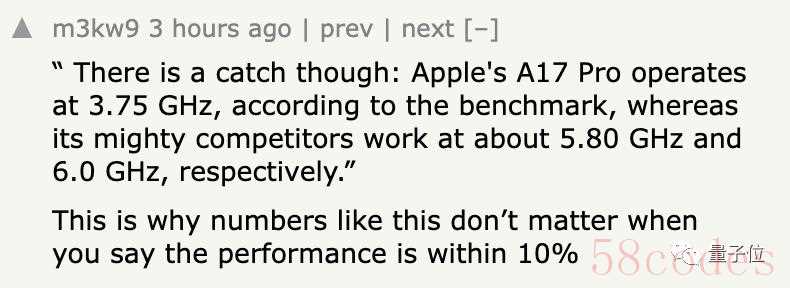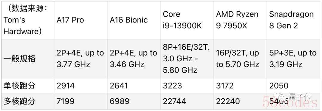 只从单核跑分结果来看,A17 Pro的2914分,竟然只和两大最新主机旗舰CPU相差了10%左右。其中,英特尔酷睿i9-13900K单核跑分3223,而AMD锐龙9 7950X的跑分则为3172。如果拎出一些其他主机CPU来看,A17 Pro甚至能勉强一战(手动狗头)但从频率来看,双方差异就比较大了。相比英特尔酷睿i9-13900K和AMD锐龙9 7950x接近6.0 GHz的频率,苹果的频率仅仅在3.75 GHz左右。而且,最终的芯片性能还是要看多核跑分情况。在这方面,苹果A17 Pro就无法和酷睿i9以及AMD锐龙比了,这二者的跑分达到了2万多,相比之下A17 Pro仅仅在7199。当然,相比苹果上一代芯片A16 Bionic,以及高通目前的骁龙8 Gen2手机芯片,A17 Pro的多核跑分还是不错的。对此,Tom’s Hardware给出了一个省流版推论:苹果对A17 Pro的CPU内核几乎没有进行架构更改,只是提升了频率。网友:A17 Pro性能接近M1