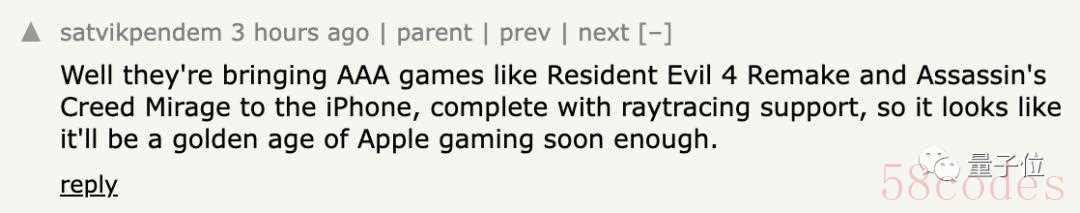 更是有网友结合苹果发布会上的一些3A大作如《生化危机4》和《刺客信条:幻景》在iPhone上演示的效果,以及光追支持,发出期待的声音:看起来苹果游戏的“黄金时代”要来了啊。