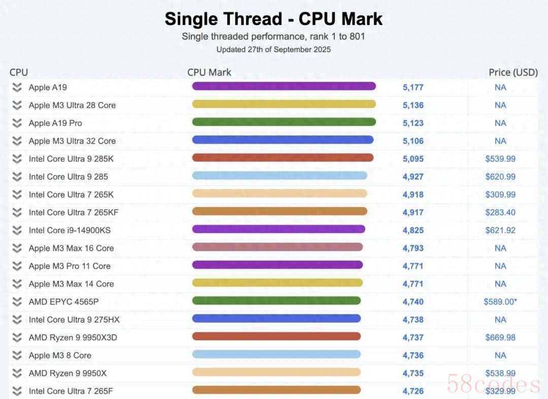 从 PassMark 给出的单核性能跑分来看,A19 单核性能达到了 5149 分,不仅仅比 A19 Pro 要强,甚至超越了苹果 M3 Ultra ,英特尔 Core Ultra 9 285K 这种超级桌面芯片。
