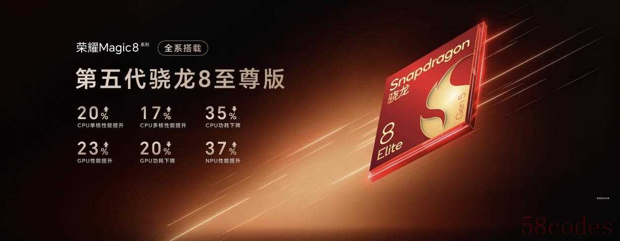 荣耀Magic8全系搭载年度最强旗舰芯片第五代骁龙®8至尊版,CPU、GPU和AI算力相比上一代都有大幅提升,性能跑分具有领先跨代表现。荣耀与高通自2022年成立了联合实验室,共同深耕新一代AI与芯片底层技术,针对芯片的各个模块定制专属优化引擎,实现超高芯片使用率。