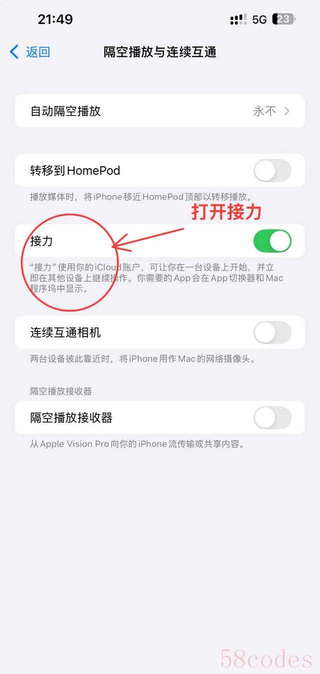 "设置方法:" 在两个设备的“设置”中,登录你的Apple ID,并确保“Handoff”选项已开启。