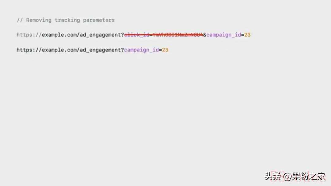 在之前的WWDC大会上,苹果分享了一个在删除跟踪参数前后的URL示例。最初的URL有一个唯一的“Click_id”参数,广告商可以用它来跟踪用户在网站上的活动,Safari则会自动删除此参数以保护用户隐私。