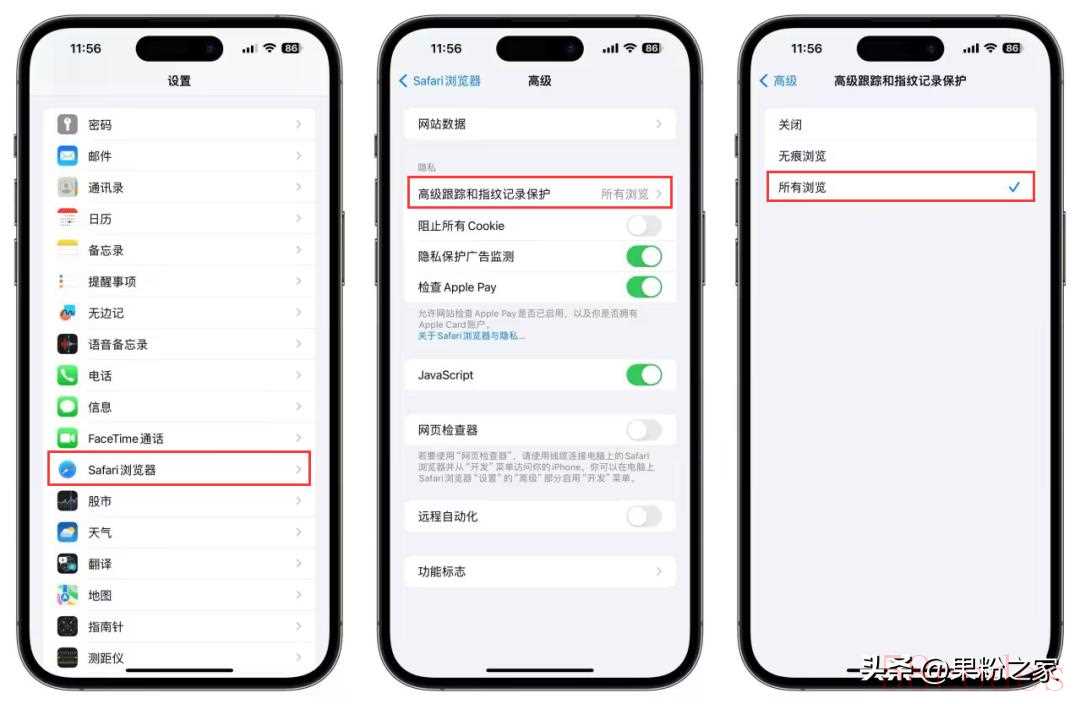 这项新功能的默认设置是在用户开启无痕浏览浏览时才会适用,如果用户希望在所有网页中开启这项防跟踪模式,就可以打开设置--Safari浏览器--高级--高级跟踪和指纹保护--选择“所有浏览”即可。当然,如果你不希望Safari浏览器阻止被跟踪的话,也可关闭这项功能。