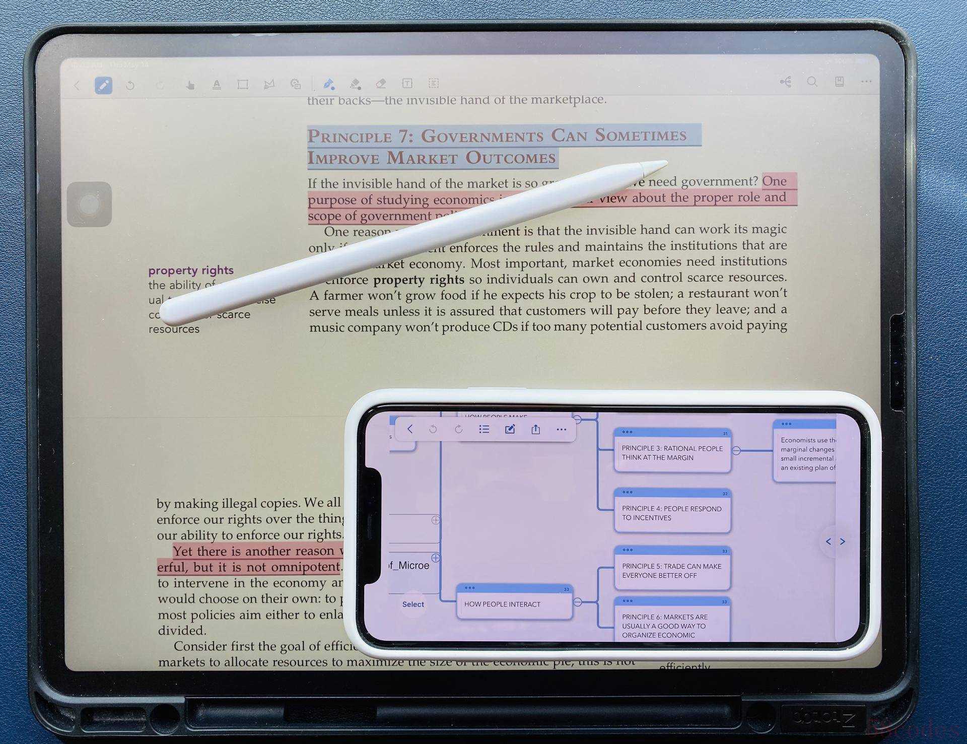 ▲MarginNote 3 的 iPad 与 iPhone 端展示,其中 iPad 展示的是打开的电子课本,iPhone 11 Pro Max 展示的是脑图。