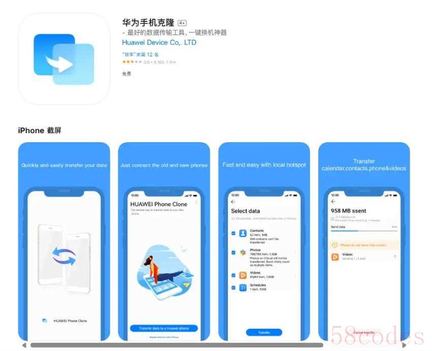 但随着技术的发展,这个过程已经变得越来越简单。如果你正考虑从苹果旧手机转向华为新手机,这篇文章将为你提供详细的指导,帮助你顺利完成数据迁移,确保你的联系人、照片、视频和其他重要数据能够安全、完整地转移到你的新华为设备上。方法一:使用华为手机克隆APP只需要一个“手机克隆”APP轻松搞定。想从其他品牌换成华为手机?很容易,官方直接下载手机克隆 App,不受品牌及系统限制,资料一键跨系统、跨平台互传,没有障碍。安装手机克隆App苹果手机:下载手机克隆APP或直接在苹果手机的App Store上搜索“华为手机克隆”,界面如下图: