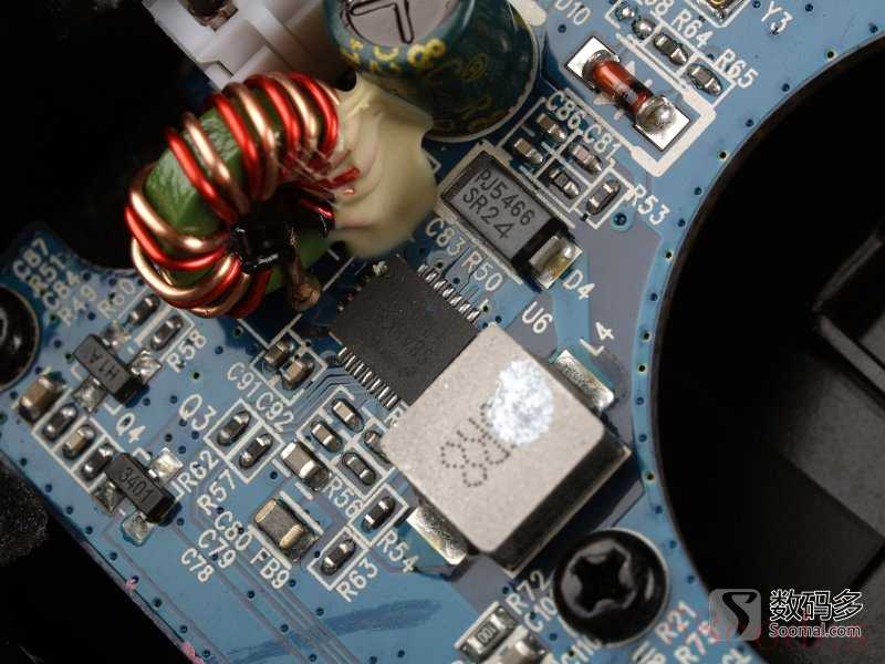 在箱体中间是电路板,电路板上掏了一个圆形的洞口,方便扬声器传过,电路板起到了隔离腔体的作用,一分为二,但并不是完全的隔离,留下缝隙,这种设计可能算得上是变种的二级倒相设计。
