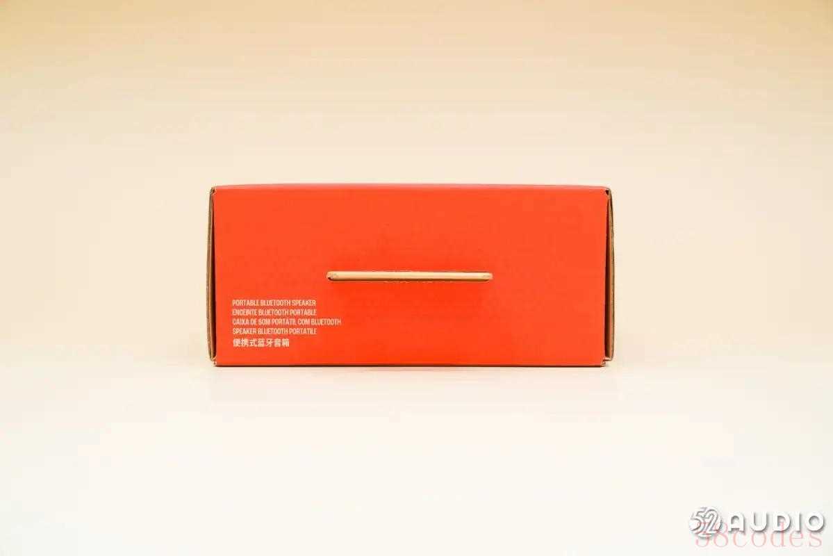 包装顶部一览,设计有一个小挂耳,并在左下方标注有便携式蓝牙音箱的产品名称。