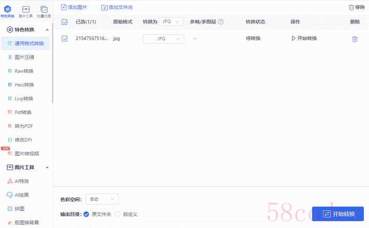 我们直接选择“通用格式转换”,或者根据现有照片的格式,选择对应操作栏上传文件,推荐使用前者,操作会更简单,再切换转换后的格式为我们需要的,最后点击“开始转换”就完成啦。