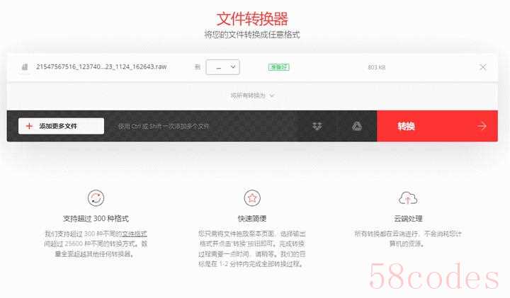 这是一款在线格式转换工具,支持超过300种不同格式,包括图像、视频、音频等类型,无需注册上传即可转换,提供高质量的转换服务,短时间内就能完成,但广告比较多,注意不要误触!