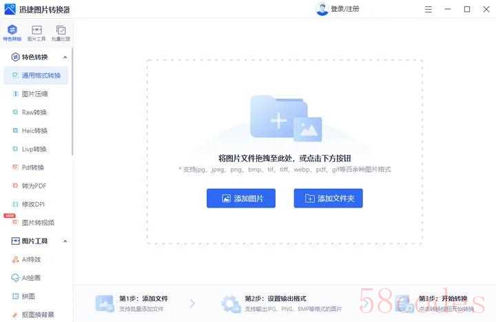 这是一款主打格式转换的图像处理工具,支持JPG、png、gif等百余种格式,并且可以将多张图片同时进行批量处理,大大提升效率,现在还提供其他实用功能,像AI绘画、智能消除笔等。
