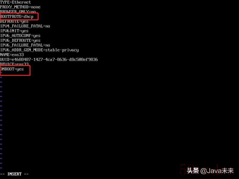 4.设置网络为dhcp动态获取,修改ONBOOT=YES,当然也可以设置成静态,静态ip需要在你的DHCP地址范围之内。
