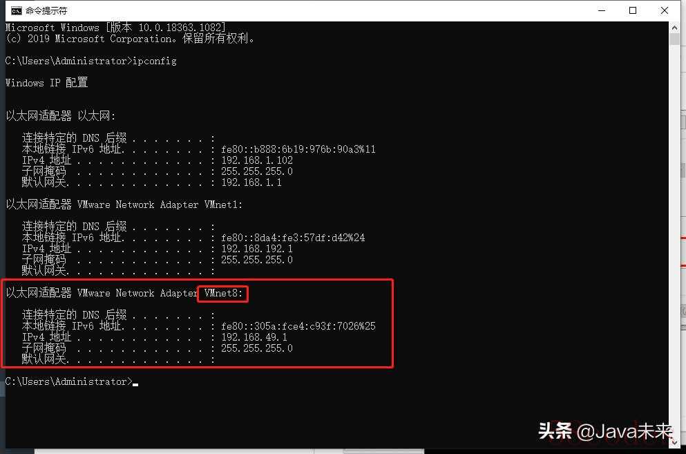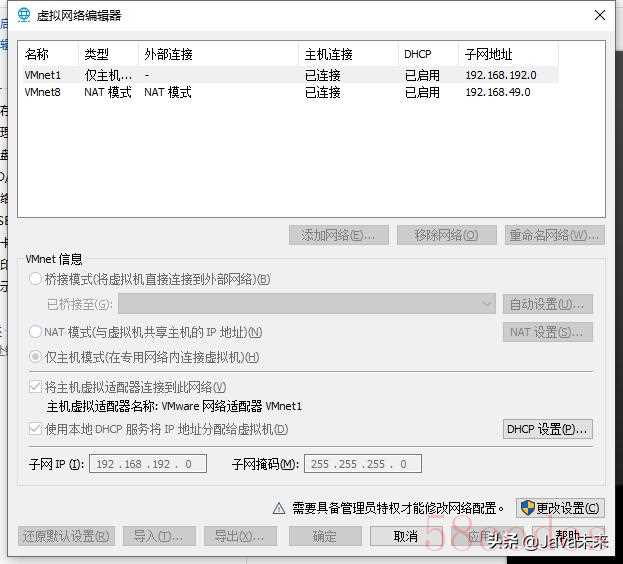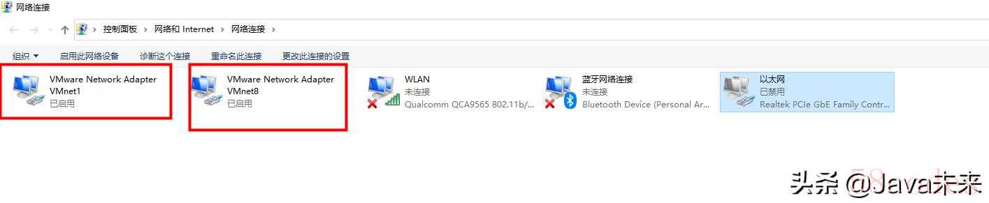 可以看到VMnet0(桥接模式)、VMnet1(仅主机模式)、VMnet8(NAT模式),其中VMnet1、VMnet8对应我们本机上的