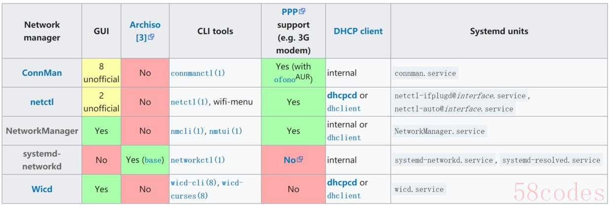 下面就是一些常见的network manager,用户利用这些管理器提供的命令行界面或者是图形界面能很容易地配置自己ip是静态的还是DHCP的,配置自己的网关,还能配置自定义的dns等,甚至还可以很容易地连接到wifi.