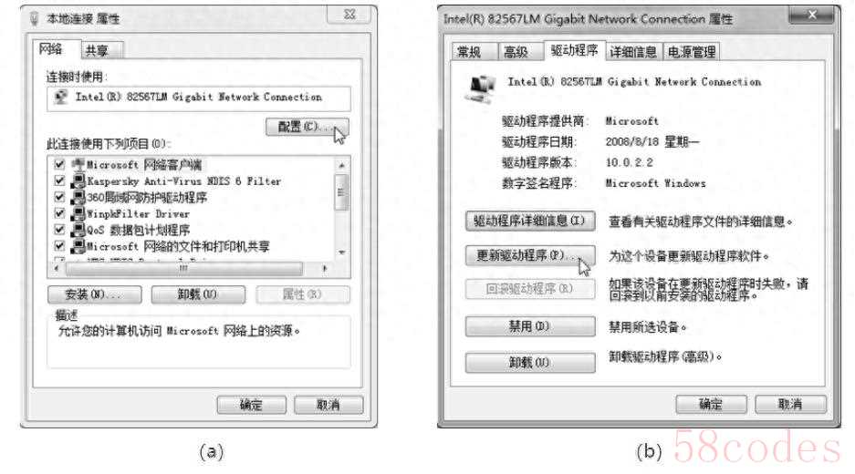 (2)如果驱动程序有问题,可以在"控制面板"的"网络和共享中心"中选择"更改适配器设置",然后在"本地连接"上单击鼠标右键,选择"属性"。弹出本地连接的设置窗口,上面的一栏是当前使用的网卡型号,点击"配置",即可以在"驱动程序"选项卡中选择"更新驱动程序",进行驱动程序的更新。如下图所示。