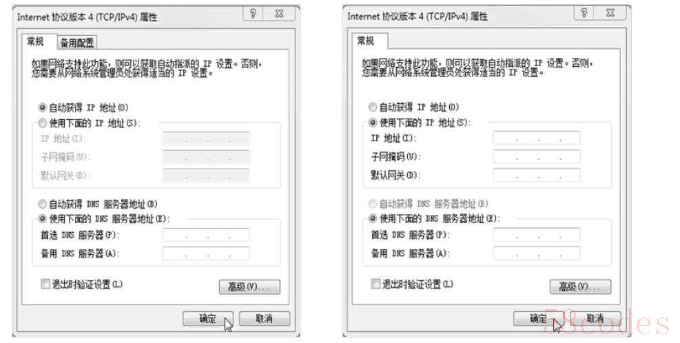 对于TCP/IP协议,添加好了之后还要进行相关的设置才能正常使用,切换到"本地连接属性"窗口,选择"TCP/IP v4"协议,单击"属性"按钮。在这个窗口中可以设置该协议,如果使用动态IP地址,则选中"自动获得IP地址"即可。若使用静态IP地址,则需要配置四个参数,即IP地址、子网掩码、默认网关和DNS服务器地址,参数由网络管理员分配。如下图所示。设置以上参数后,单击"确定"按钮,TCP/IP协议就设置完成。完成以上的配置后,就可以访问Internet了。