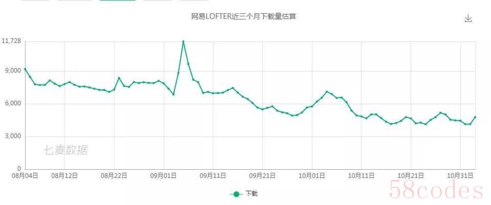 从下载量的趋势图我们可以看出,暑假期间LOFTER的下载量基本保持在7000以上,而国庆过后就趋于4000~5000。其在应用榜上的排名较低,几乎都在中下游。但是在ios社交榜上的排名冲进了前五十,说明LOFTER仍然是一款很有发展潜力的社交app。