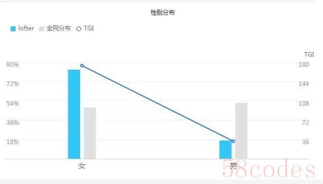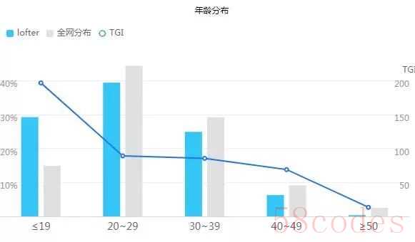 在性别占比中,LOFTER的女性用户数量和TGI指数都明显高于男性用户。猜想主要原因是因为女性对于艺术和创作更具敏感性,也更愿意在社交平台上分享自己的作品。