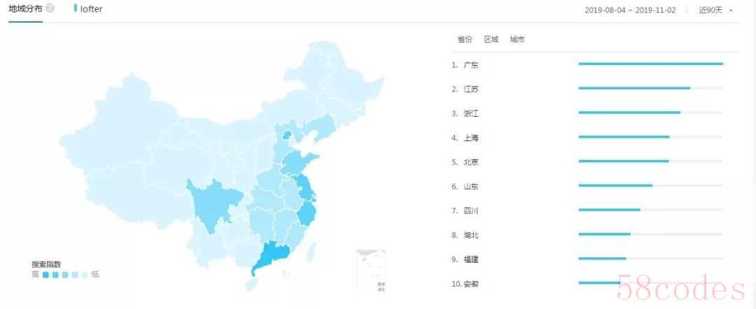 由百度指数可见,LOFTER的用户大多在广东,其次是江苏、浙江、上海北京等沿海一线城市。这类城市生活的用户大多经济良好,且愿意花费时间和金钱以支撑自己的兴趣爱好,对于精神食粮方面的需求也较多。
