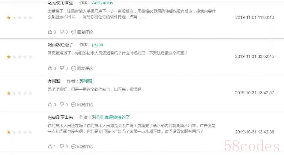 差评主要集中在网页版的后台问题上。很多用户表示注册登录时无法使用手机号,或者网页版经常崩坏,看不了图片也刷新不了页面,严重影响用户的使用体验。作为一款创作型社交软件,LOFTER上的大多数作品是以图片的形式呈现出来。如果软件的后台不足以支撑,不仅仅是对于普通用户,对于创作者也是非常严重的打击。