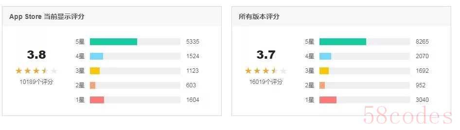 LOFTER在两个版本的评分分别为3.8和3.7,较为均等,但只能算是在中上游。虽然五星评价较多,但一星到四星的评价都占了不少的数量,说明LOFTER还有很多进步的空间。