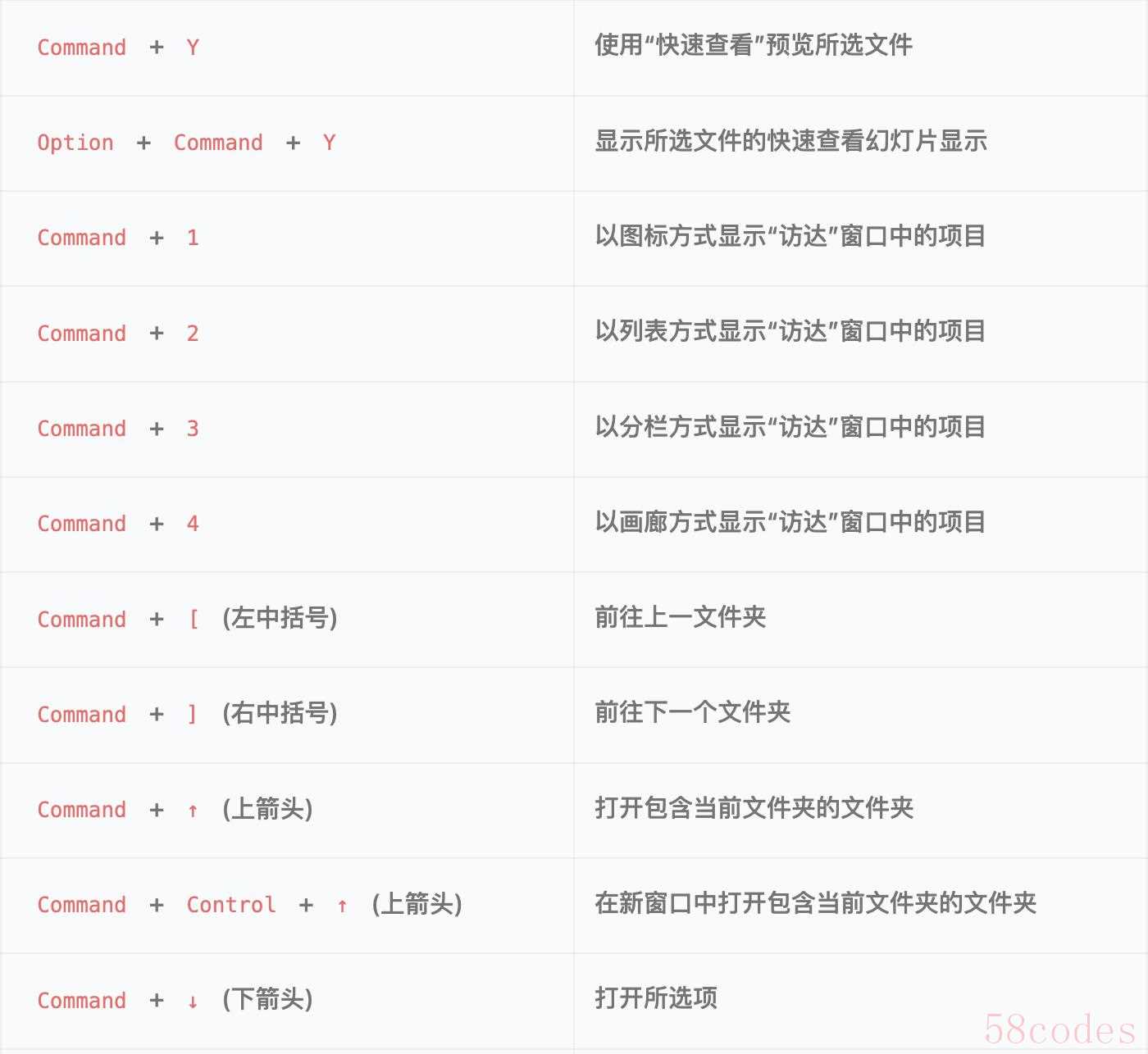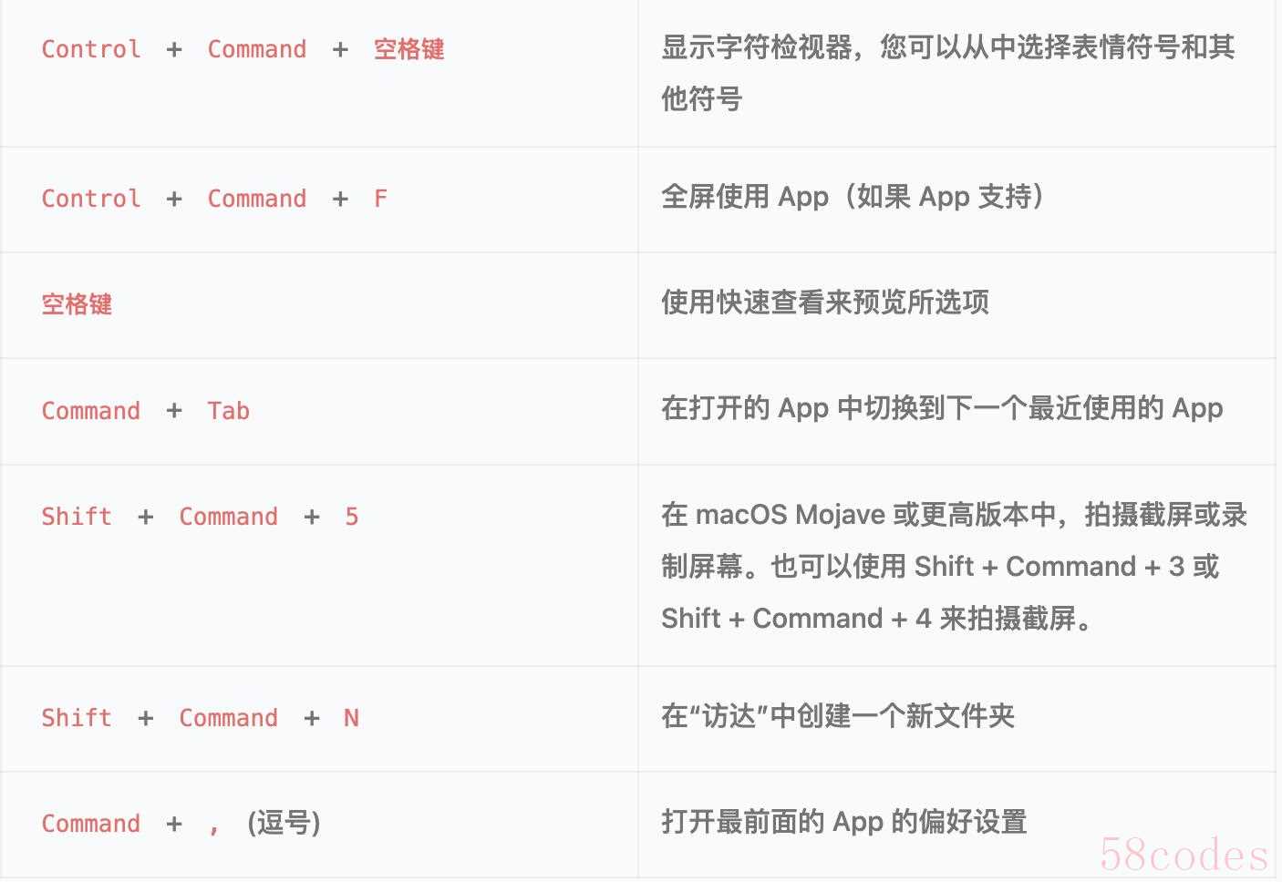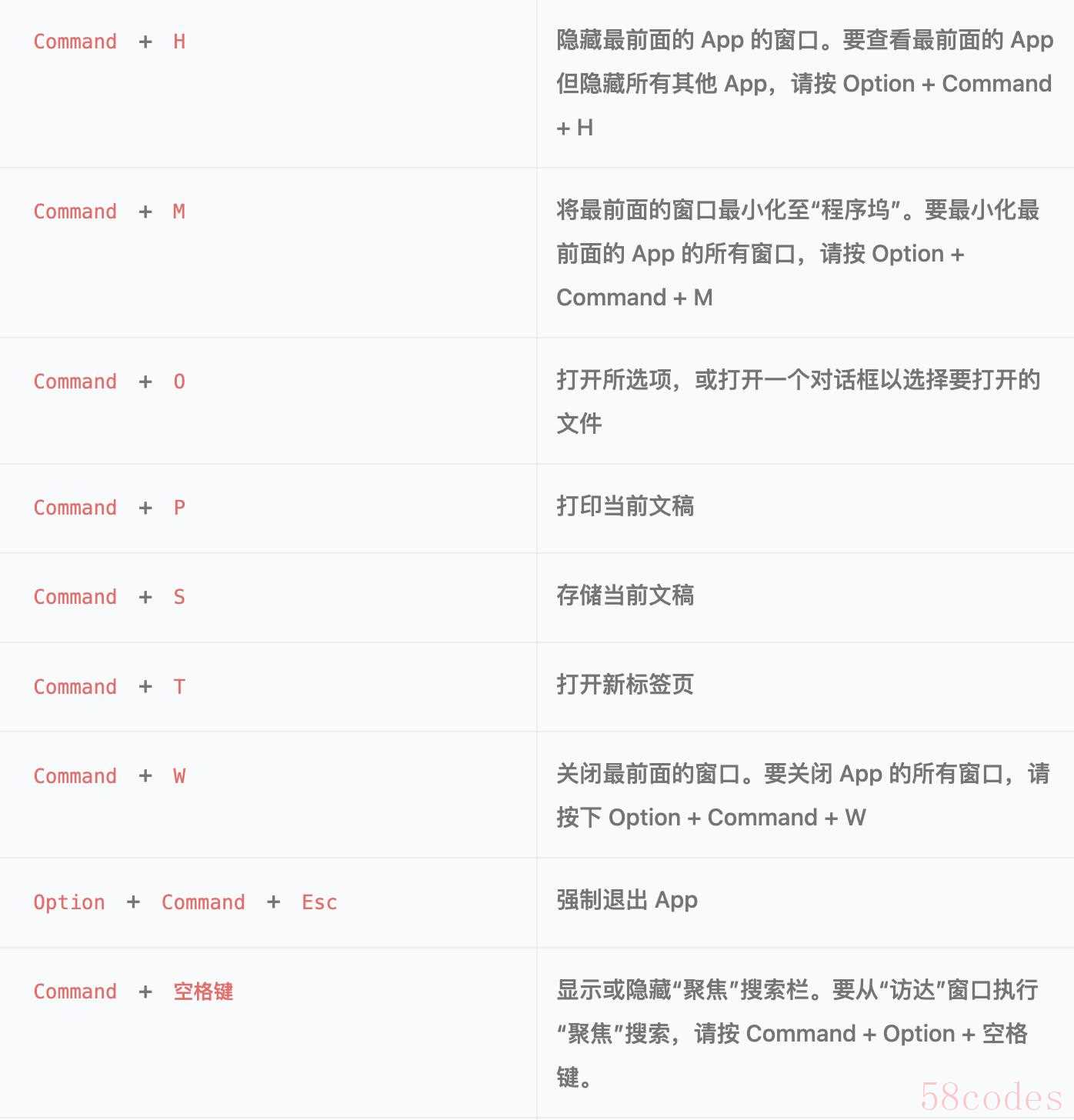 | `⌘` + `N` | 新建 | 新建文档、窗口、 Finder 项目等 |
