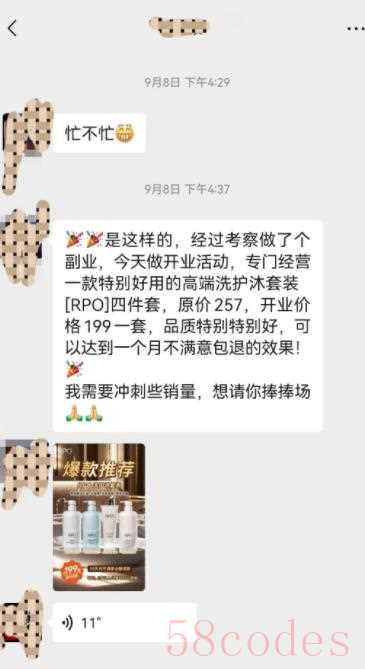 汪先生收到一位微信好友发来的促销信息,称其正在争取某洗护品牌的代理资格,说“只要再卖几套就能免费代理”,并表示“这个人情我记下了”。汪先生心生警惕,没有立即转账,而是反问对方身份,对方才坦言是“帮一个朋友转发的”。