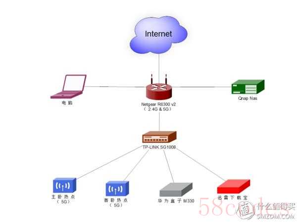 ▼家中简易网络拓扑如下,Nas通过链路聚合跟路由器连接,所以占了两个千兆口,无奈要接别的设备只能挂个交换机
