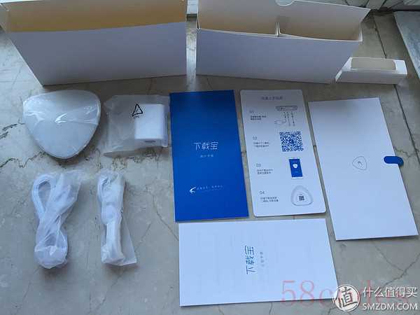 ▼全家福,下载宝的包装有点奇葩,不是正面开盖,而是从侧面打开,里面盒子套盒子的,里面东西不少,网线,电源线,各种说明保修卡