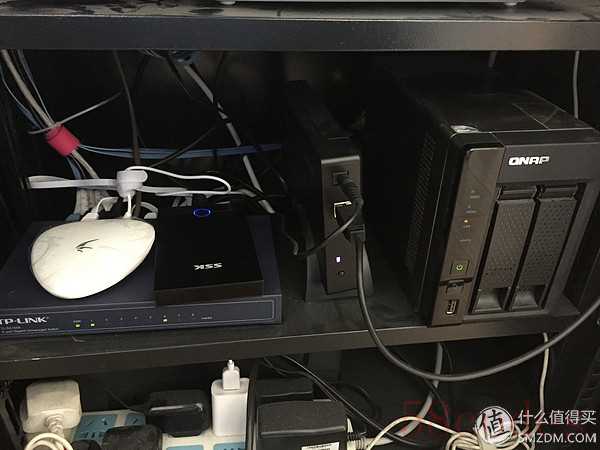 ▼回家接上电源、网络和硬盘,锁进我的小机柜里(家里有熊孩子,不得不防)下载宝临时接上我平时用的移动硬盘,旁边立着的3.5寸移动硬盘接在路由器上,是用来远程下载的。旁边是QNAP 296L,家里的一切数据都在里面,硬盘坏过一块,换了一个硬盘自动恢复一下数据之后就继续服役了,7*24小时开机,很稳定,但是不敢拿它远程下载了,估计上一块就是下载跑坏的。下载宝下面的是tp的千兆交换机,家里主干网是全千兆,一部分通过它来交换数据,到手一年多一直稳定工作从未死机。下头插排后面还有个UPS,停电了也有给我关nas的时间。