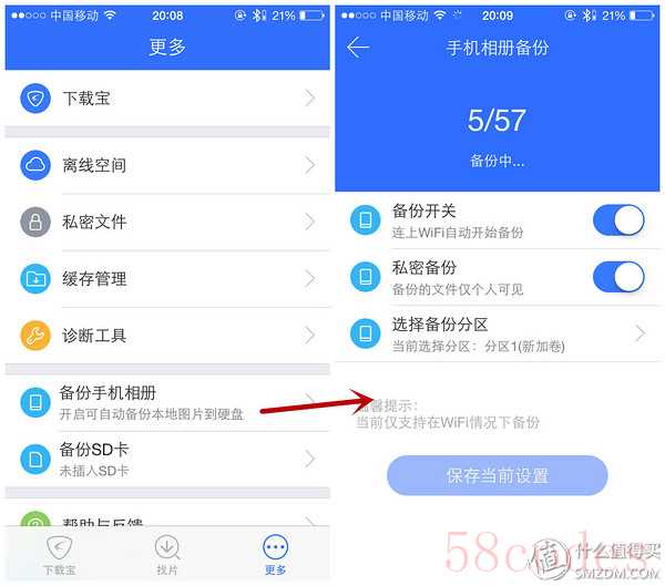 ▼备份相册,说是连上WIFI自动备份,但前提条件是下载宝的软件不能关闭,实在谈不上自动,我的Nas也有相册备份,同样不开软件不会自动的。如果备份的时候选择了私密备份,在电脑上是看不到硬盘里备份的照片的。