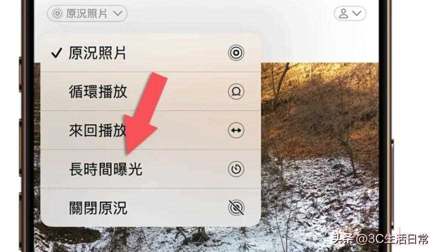 设置方法:打开“实况照片” - 点击左上角下拉选单,选择“长时间曝光”